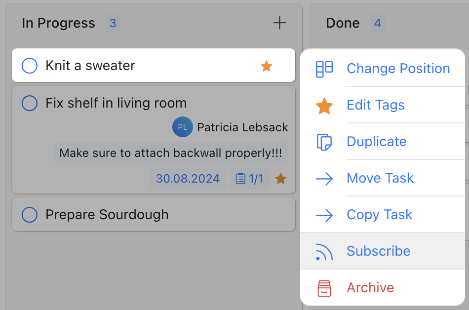 Um ein einzelnes Item zu abonnieren, öffnen Sie das Menü „...“ am oberen Rand des Items oder das Schnellbearbeitungsmenü des Items und wählen Sie dann „Abonnieren“ aus der Dropdown-Liste.