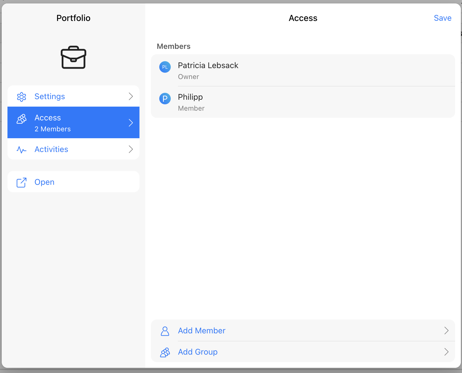 Um den Zugriff zu verwalten, öffnen Sie das gewünschte Portfolio und klicken Sie auf das kleine Team-Symbol in der oberen rechten Ecke des Portfolios. Dies führt Sie direkt zum Menü Zugriff, in dem Sie die aktuellen Mitglieder anzeigen, neue Mitglieder hinzufügen und Gruppen erstellen können.
