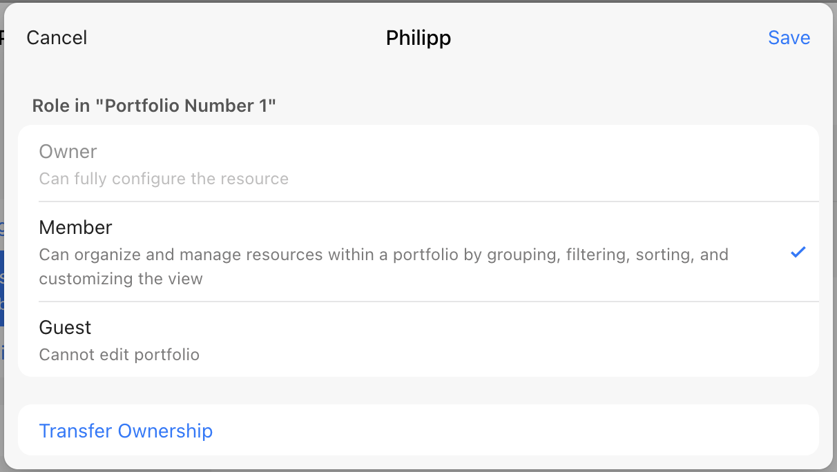 Benutzer können innerhalb eines Portfolios drei verschiedene Rollen einnehmen. Es gibt immer einen „Eigentümer“, der die Ressource vollständig konfigurieren kann, dann gibt es reguläre „Mitglieder“, die die Ressource innerhalb eines Portfolios durch Gruppieren, Filtern, Sortieren und Anpassen der Ansicht organisieren und verwalten können. Zu guter Letzt gibt es „Gäste“, die Portfolios nur ansehen, aber nicht bearbeiten können.