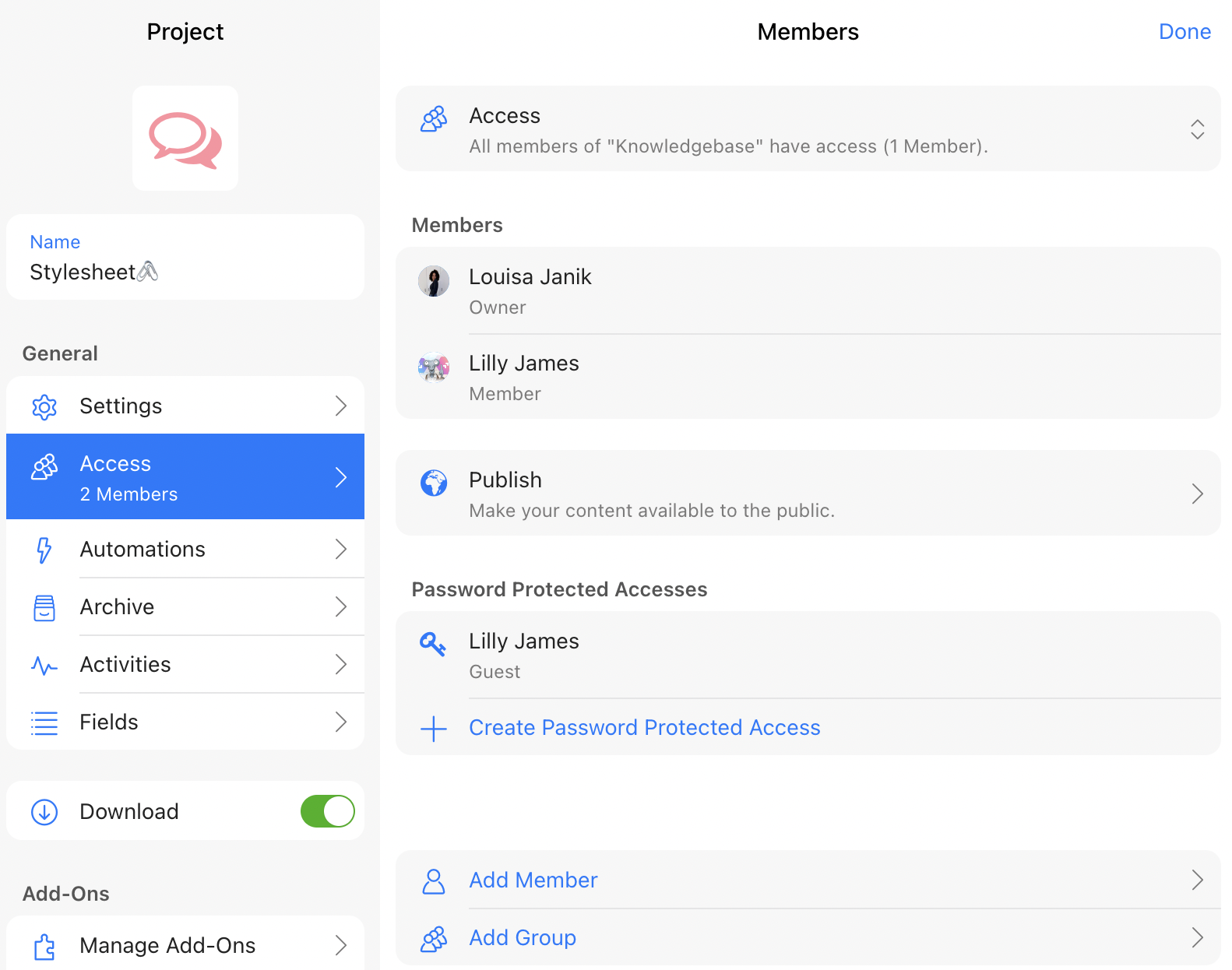 Access control is particularly helpful in lists that contain many members and items. Using this feature, you can now play back the contents individually for all members and also adjust their roles and rights.